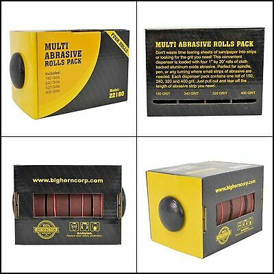 Don't waste time tearing sheets of sandpaper into strips or looking for the grit you need! This convenient dispenser is loaded with four 1-inch by 20-foot rolls of cloth backed aluminum oxide abrasive. Perfect for spindle, pen, or any turning where small strips of abrasive are needed. Each dispenser pack contains one roll of 150, 240, 320 and 400 grit. Just tear off the length of abrasive strip you need.
